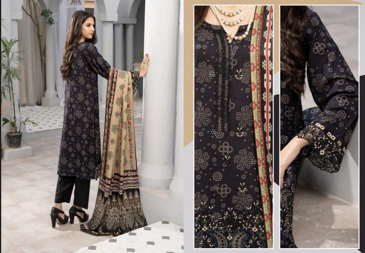 3 piece dhanak embroidered suit with printed shawl